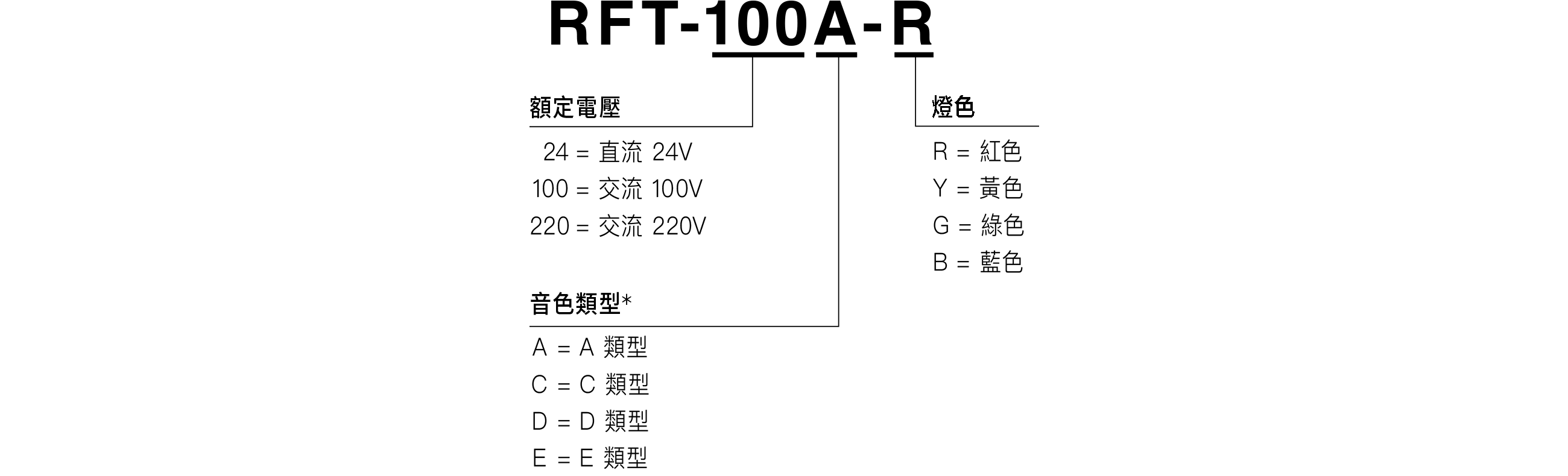 RFT-100□-R/Y/G/B | 交流 100V | A / C / D / E | 紅 / 黃 / 綠 / 藍 |