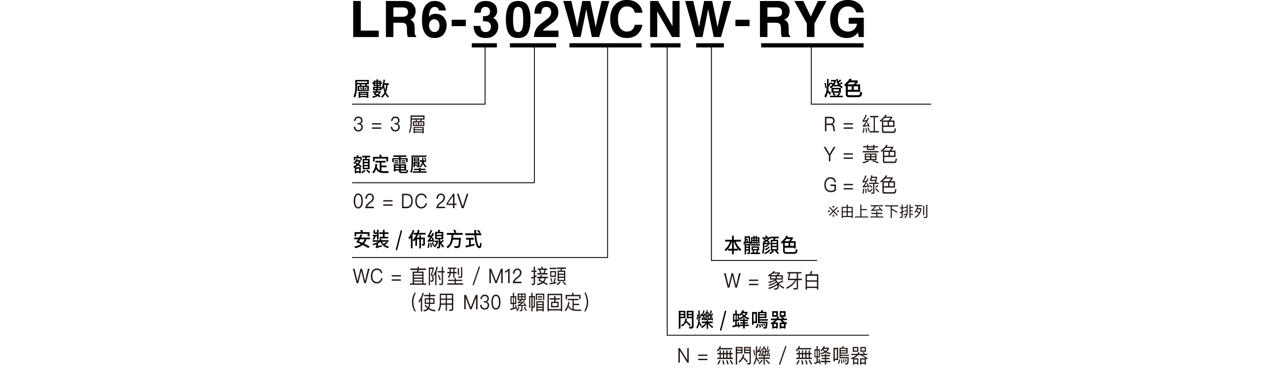 LR6-302WCNW-RYG | 3 | DC 24V | 直附型 / M12 接頭 (使用 M30 螺帽固定) |