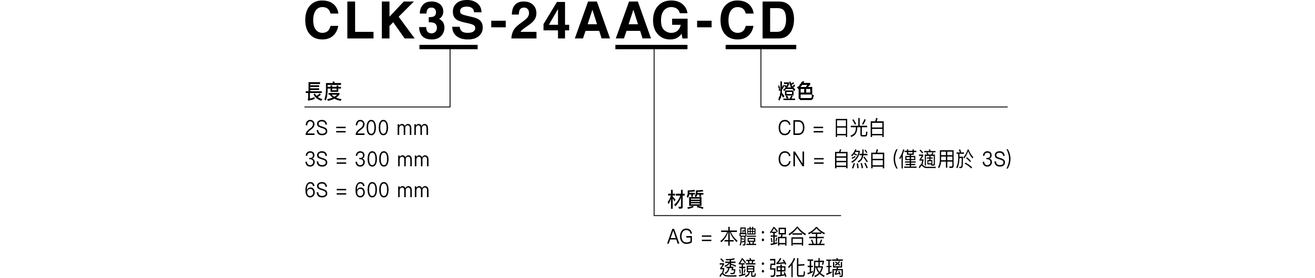 | CLK3S-24AAG-CD/CN | 直流 24V | 300 mm | 鋁合金 | 強化玻璃 | 0.5m 電纜 | CD:日光白 CN:自然白 |